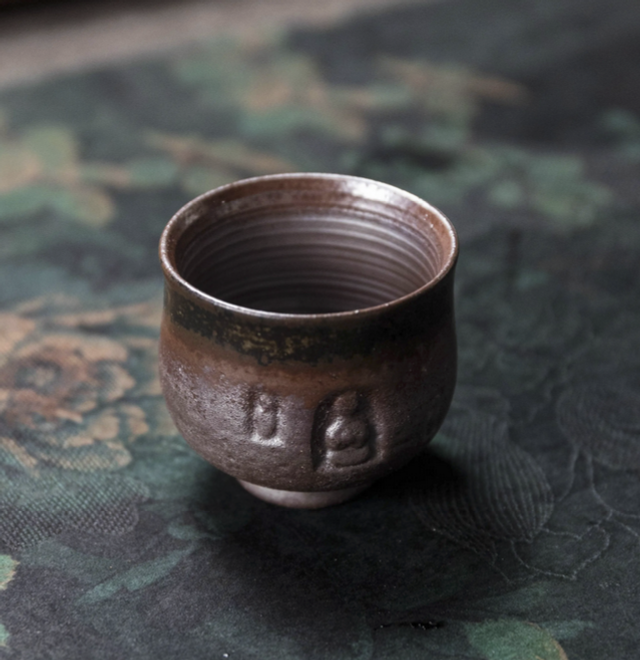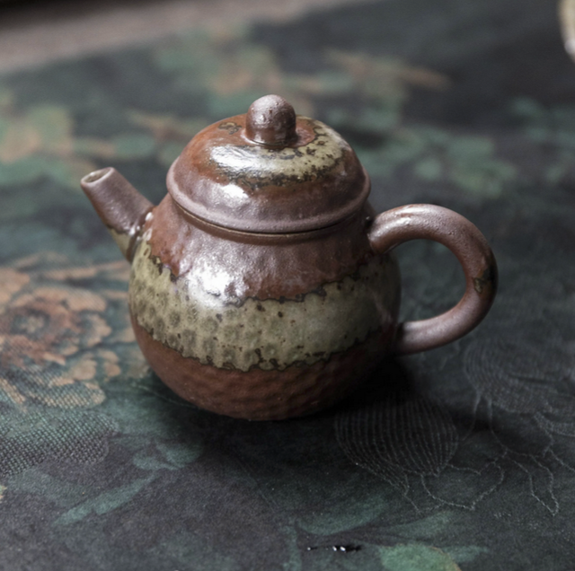 A rustic clear-fired stoneware tea set with natural kiln textures and earthy glazes, consisting of a pear-shaped teapot, a compact thick-walled cup, and a shallow pot rest, designed for small-volume gongfu tea brewing.